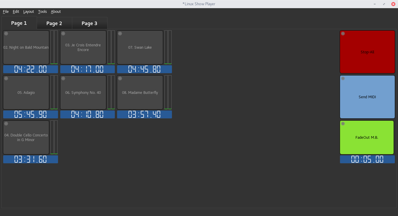 linux-show-player est un lecteur conçu pour une utilisation lors de pièce de théâtre ou similaire et pouvant aussi trouver sa place en radio pour lancer des cartouches sonores.