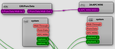 Je suis en train de bricoler un patch Pure data pour recevoir et envoyer des signaux à (entre autres) mon contrôleur Akai APC mini.