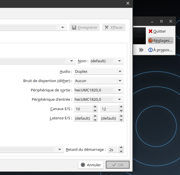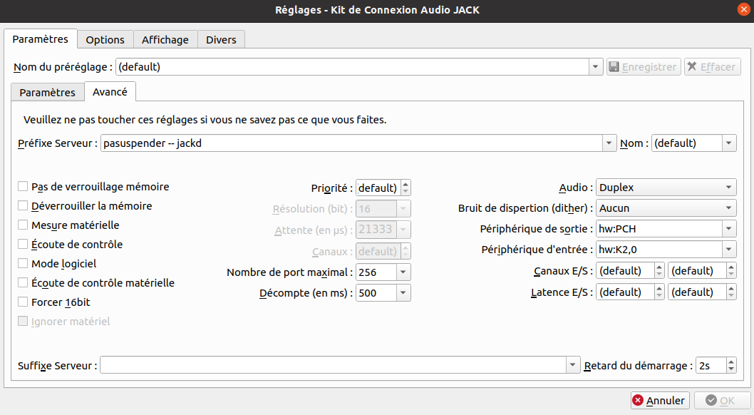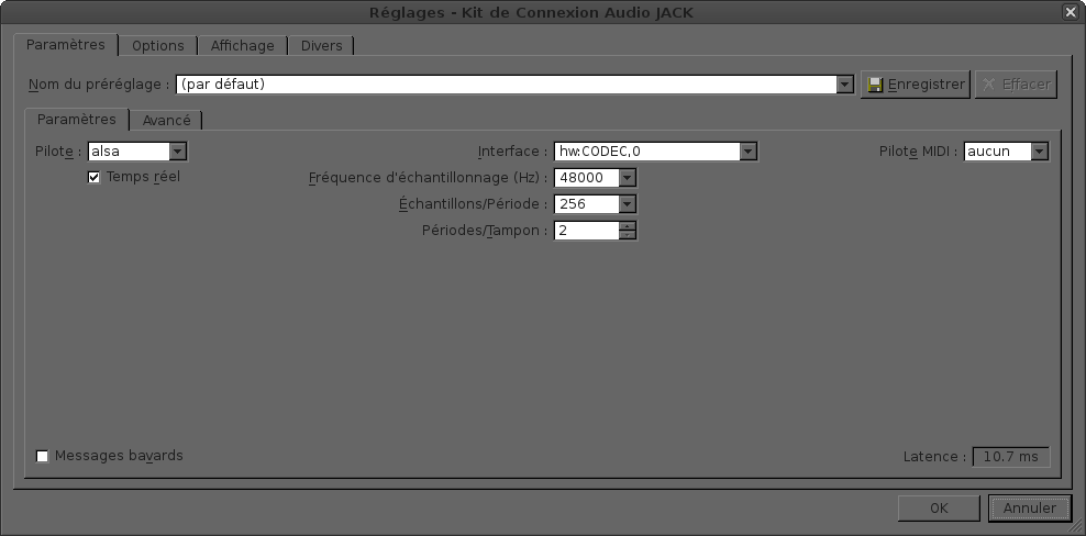 J'avais sélectionné DirectSound dans le menu déroulant (parce que ça marchait avec la M-Audio), et rentré les mêmes paramètres de Fréquence d'échantillonnage, d'Echantillons/Période et de Période/Tampon que dans les réglages de QJackCtl. Cette fenêtre-là :