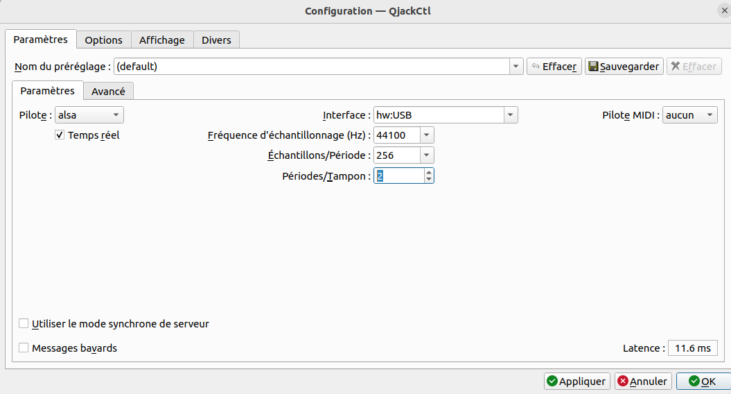 Passe tes échantillons/période à 512 et Période/tampon à 3 puis relance jackd.