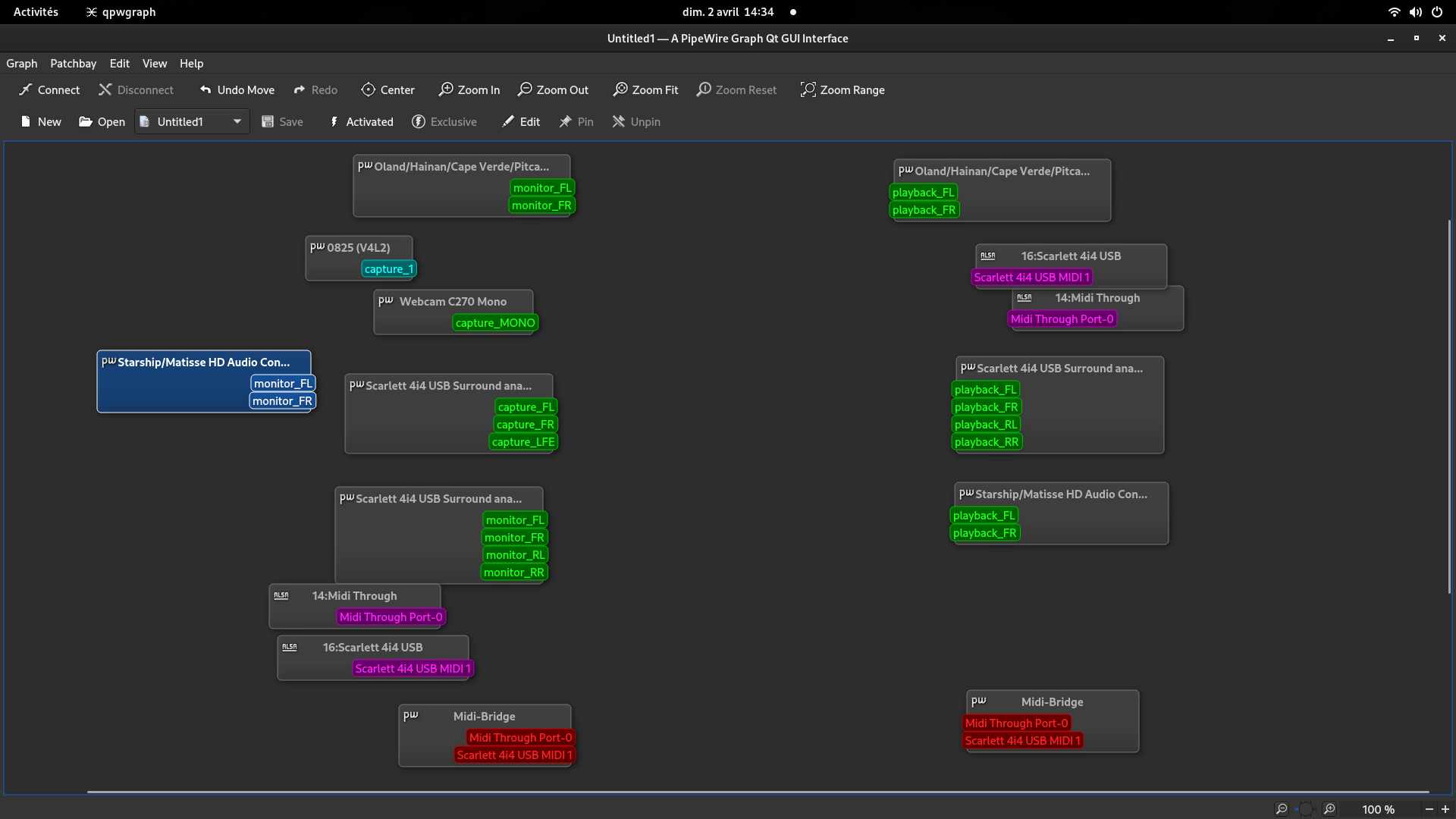 Donc là je viens juste d'installer fedora et l'installation est hyper simple. D'entrée de jeu je fais mes premiers pas avec pipewire et j'ai installé direct gpwgraph pour voir que d'entrée de jeu toutes mes entrées sorties appraissent : WAOUH!