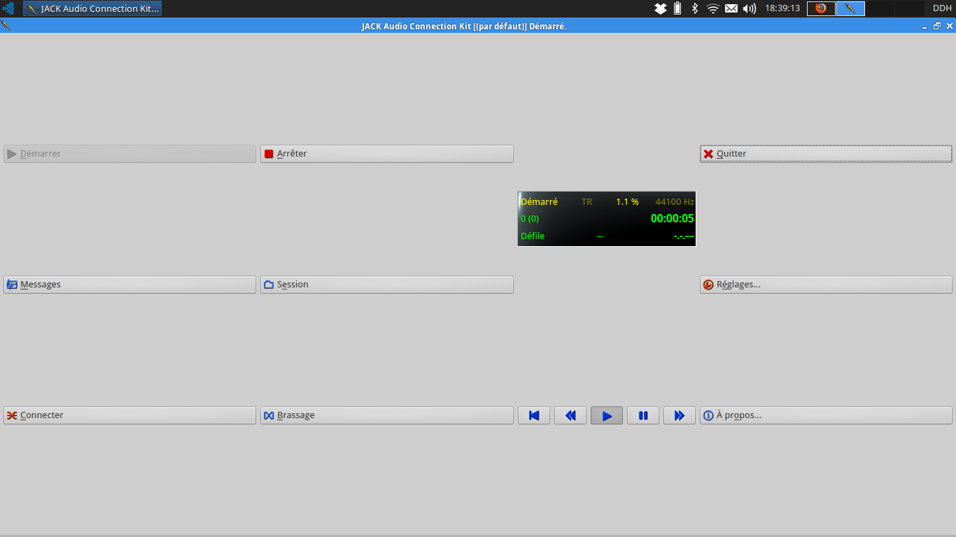Il me dit pas 44.1khz dans l'onglet message, il affiche 44.1khz sur l'écran de contrôle (la fenêtre d'infos noire entre les boutons Arrêter et Quitter de la fenêtre d’accueil de Qjackctl).