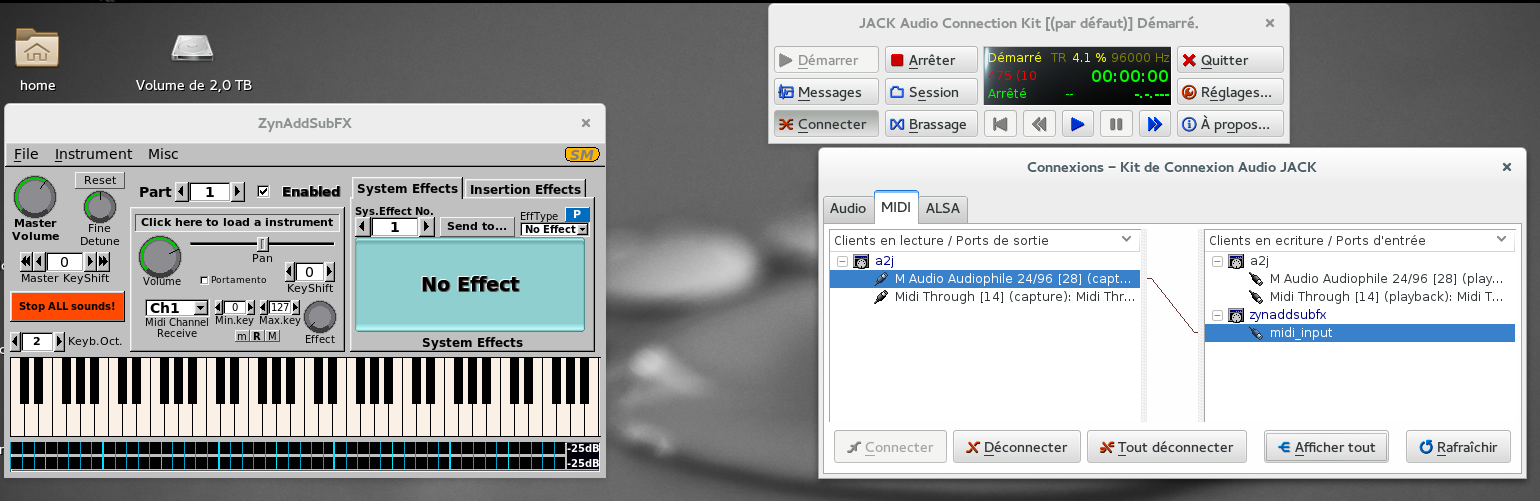 J’ai connecté la sortie physique MIDI du GR-55 à l’entré physique MIDI de la M-Audio. Cependant, en dépit de l’utilisation de A2j, je ne parviens pas à contrôler quoi que ce soit par signaux MIDI : ni FluidSynth, ni ZynAddSubFx, ni même à enregistrer le moindre évènement dans Rosegarden. Pourtant, dans QJackctl, je connecte bien la sortie – logiciel, donc – MIDI de la M-Audio vers les entrées des différents logiciels que je cherche à contrôler par MIDI.
