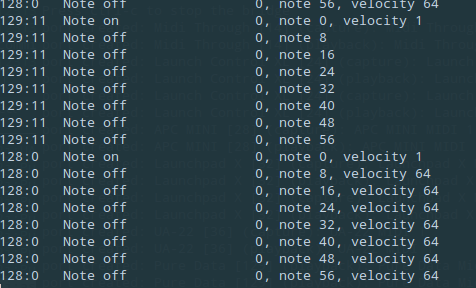 aseqdump par ces 2 ports:La différence: les NoteOff envoyés par a2j ont une vélocité, qui plus est non nulle ! Ça ne fait sans doute pas grande différence dans la plupart des cas, mais dans le cas de l'API mini il se trouve que ça en fait une, les LEDs ne s'éteignent pas si la vélocité est non nulle !