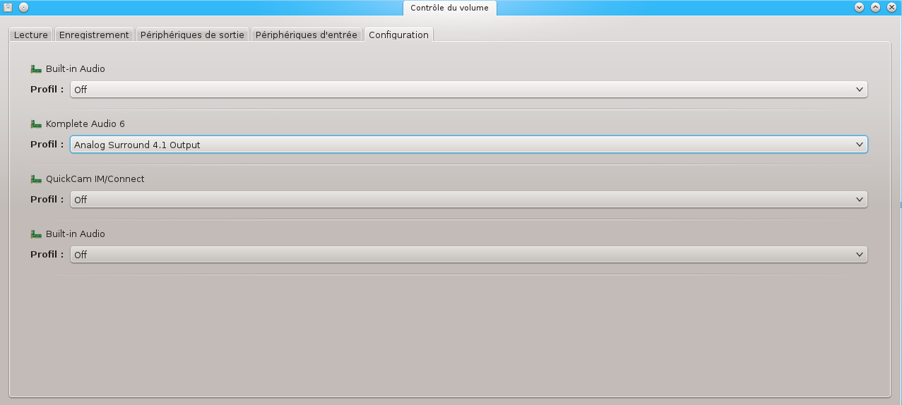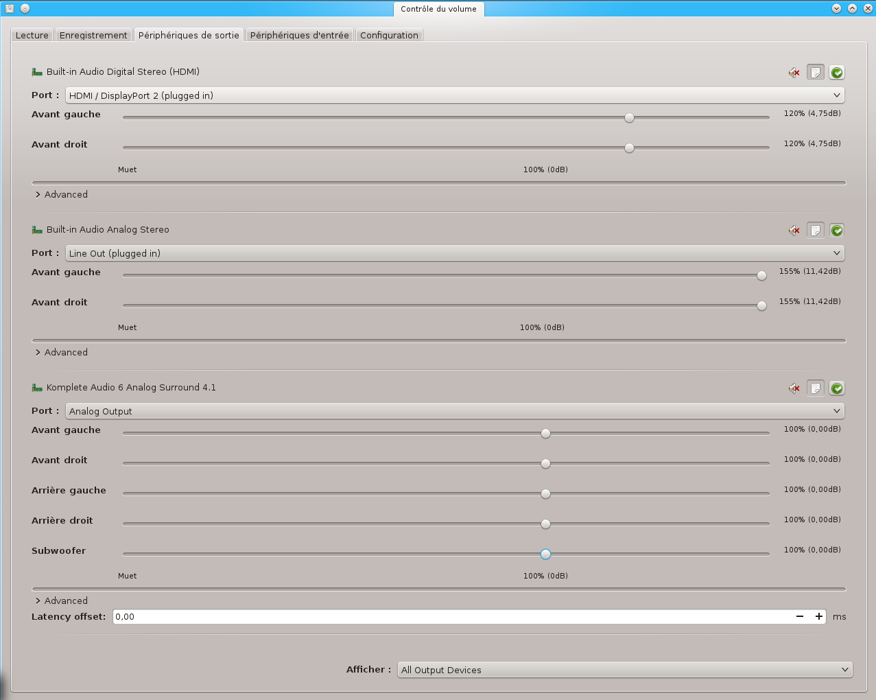[alamo@localhost ~]$ __aplay -l__ **** List of PLAYBACK Hardware Devices **** card 0: HDMI [HDA Intel HDMI], device 3: HDMI 0 [HDMI 0] Subdevices: 1/1 Subdevice #0: subdevice #0 card 0: HDMI [HDA Intel HDMI], device 7: HDMI 1 [HDMI 1] Subdevices: 1/1 Subdevice #0: subdevice #0 card 1: PCH [HDA Intel PCH], device 0: ALC892 Analog [ALC892 Analog] Subdevices: 0/1 Subdevice #0: subdevice #0 card 1: PCH [HDA Intel PCH], device 3: ALC892 Digital [ALC892 Digital] Subdevices: 1/1 Subdevice #0: subdevice #0 card 3: K6 [Komplete Audio 6], device 0: USB Audio [USB Audio] Subdevices: 1/1 Subdevice #0: subdevice #0 [alamo@localhost ~]$