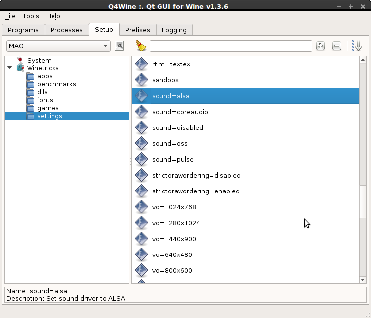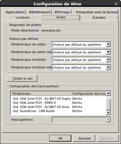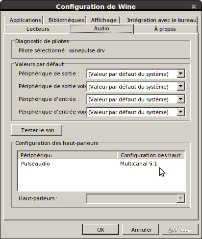En fouillant un peu sur le net, j'ai vu qu'il fallait activer les drivers Jack et ALSA dans l'onglet Audio de wincfg, comme le montre par exemple la page Wine de LinuxMAO...