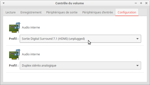 L'idée était donc d'utiliser le fait que tu as probablement deux cartes sons, une PCH et l'autre HDMI, (à moins évidemment qu'elles soient au niveau de la connection carte-mêre fusionnelles et tu serais hélas revenu au non-problème précédent).
