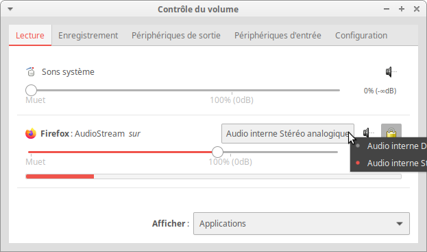 Auquel cas, JACK n'est pas forcément requis dans mon cas, l'application de contrôle du volume de PulseAudio (Pavucontrol) propose tout ça par défaut : pour chaque application qui sort du son, il est possible de choisir vers quel périphérique envoyer ce son.