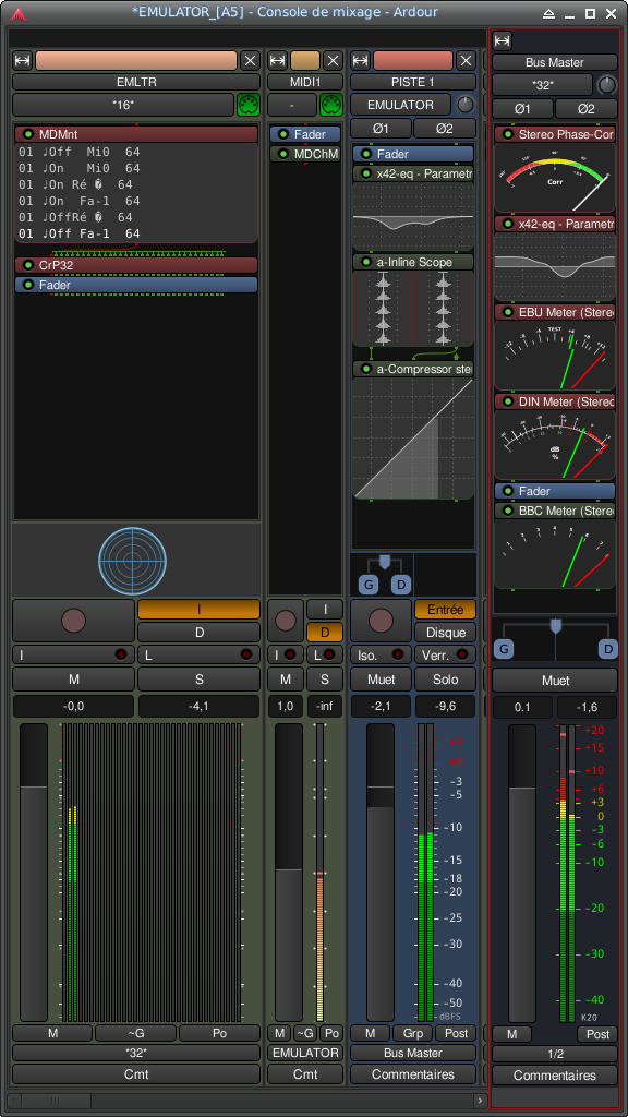 Certains des greffons ont désormais des indicateurs (ou autres formes d'affichage) visibles dans les tranches de la console d'Ardour (il faut cependant au moins Ardour 5 ainsi que les x42 dans des versions suffisamment récentes).